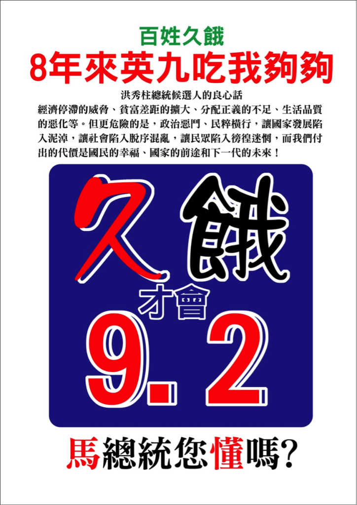 掌握國會四分之三席次,卻無法制定辦案辦得荒腔走板的「最高檢察長」的退場機制;可修憲定位,是總統制、內閣制或雙首長制,卻不作為。司法制度有問題不敢面對,叫做不干涉司法,口喊依法行政誰不會?過時的爛法制度有問題,還寄望依什麼法?如此懈怠,您既然敢說8年來沒有對不起臺灣!臺灣人民只好很有禮貌的「冊封您為9.2趴的總統」!