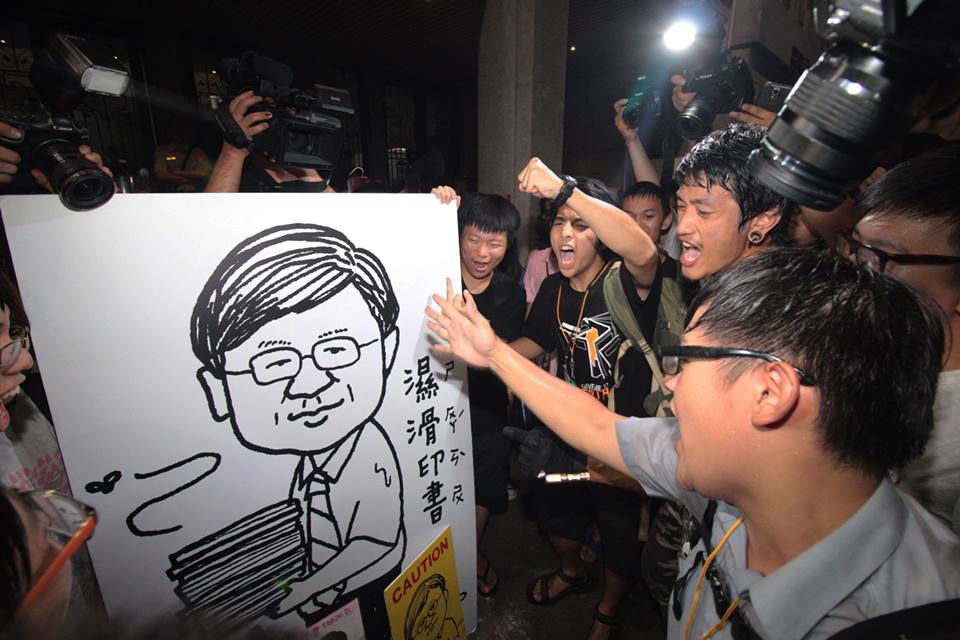 包括學生運動在內的新世代政治活動,瞬息萬變的科技社會,新生代的創新突破能力,均是社會進步,政治發展的主要動力。圖為反黑箱課綱學生宣布撤場後,對吳思華(濕滑)畫相抗議。(黃謙賢攝)