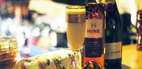 以Hine Fine Champagne Cognac與Pierre Ferrand Curaçao調成的「玉蘭花(Magnolia)」。(圖:La Petite Chambre 小房間)從倫敦前往巴黎工作的哈利.麥克艾爾馮(Harry MacElhone)於1923年再版的《ABC of Mixing Cocktails》,提及「玉蘭花」的酒譜綜合富凱與紐曼兩者版本,以各一茶匙的柑橘酒與糖漿,1小杯白蘭地(不特定使用Cognac)和一顆新鮮蛋黄,搖盪濾冰倒進中型葡萄酒杯,再緩緩注入香檳。
