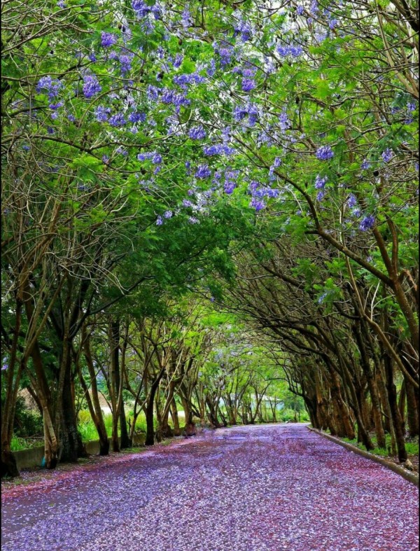 嘉義縣民雄鄉的藍花楹花道。(趙令級牧師提供)