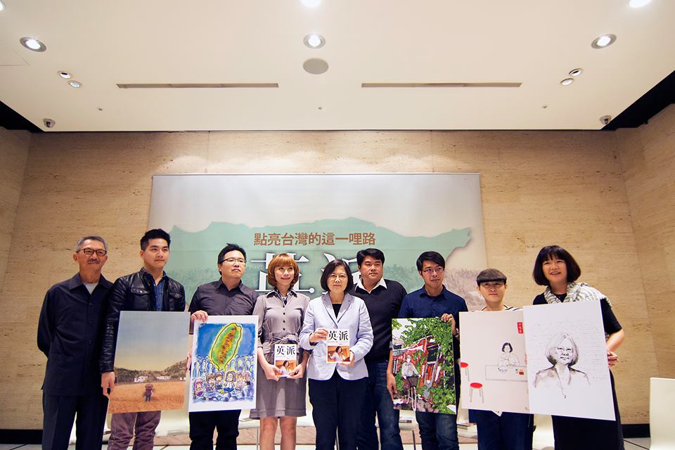 蔡英文今天舉行《英派:點亮台灣的這一哩路》新書發表會,並邀請書中扉頁插畫家海豚男、奧斯卡、1/2藝術蝦、米力等人分享創作理念,圓神出版社社長簡志忠、部落格作家貴婦奈奈及補教人氣歷史老師呂捷等人亦出席,分享讀後感。